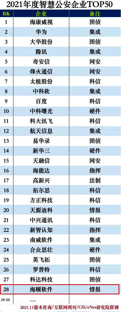 海颐软件入选2021年中国智慧公安企业50强